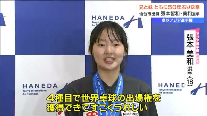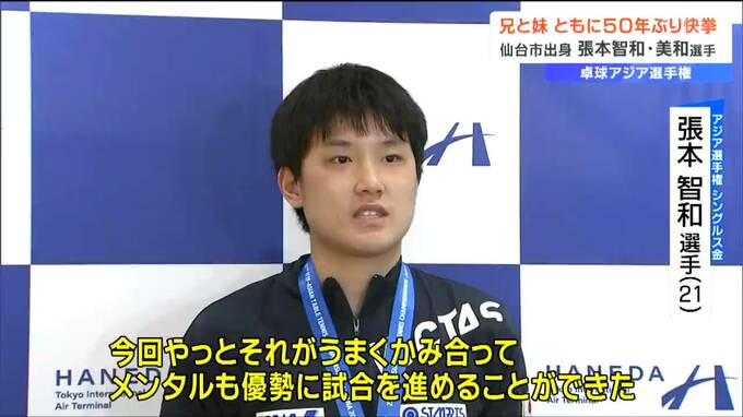 歴史的快挙です。卓球のアジア選手権に出場した仙台市出身の張本智和選手と美和選手がきょうだいでいずれも50年ぶりとなる金メダルを獲得、喜びと共に15日、帰国しました。