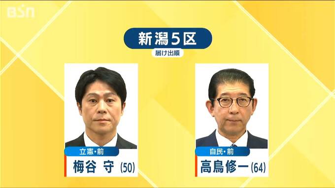 『新潟5区』は前職同士の「一騎打ち」 それぞれの第一声【衆院選】 To view this video please enable JavaScript, and consider upgrading to a web browser that supports HTML5 video 新潟放送 2024年10月15日(火) 19:14 国内 15日に公示された『第50回衆議院議員総選挙』で新潟5区に立候補したのは、届け出順に ・立憲民主党の前職 梅谷守さん(50) ・自民党の前職 高鳥修一さん(64) です。 前職同士による一騎打ちとなります。