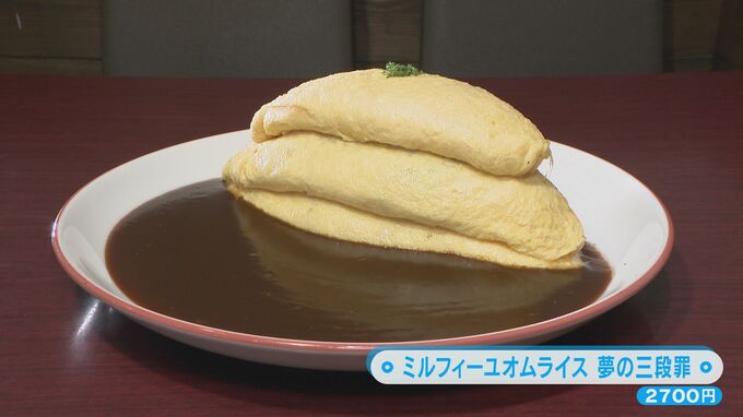 人気は「ミルフィーユオムライス 夢の三段罪」。上からチーズオムレツ、シーフードピラフとチキンライスのオムライスの合わせて3種がのった、食べて「罪悪感」を感じるほどの豪華な一品です。