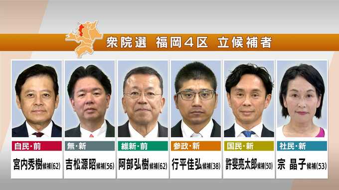 衆議院選挙が15日公示され福岡県では11の小選挙区に過去最多の52人が立候補しました。福岡4区と福岡5区の候補者を紹介します。宗像市や粕屋郡などを選挙区とする「福岡4区」。「保守分裂」の構図となり、前職2人と…