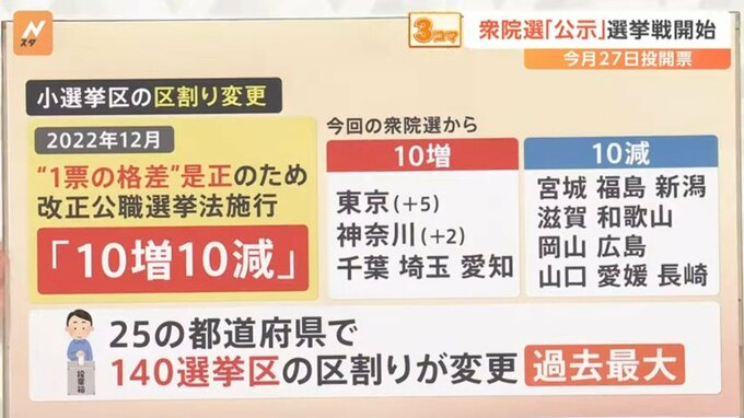 今回の衆院選は前回と異なる部分があります。まずは「小選挙区の区割り変更」です。2022年12月に“1票の格差”是正のため改正公職選挙法が施行され、今回からいわゆる「10増10減」が行われます。