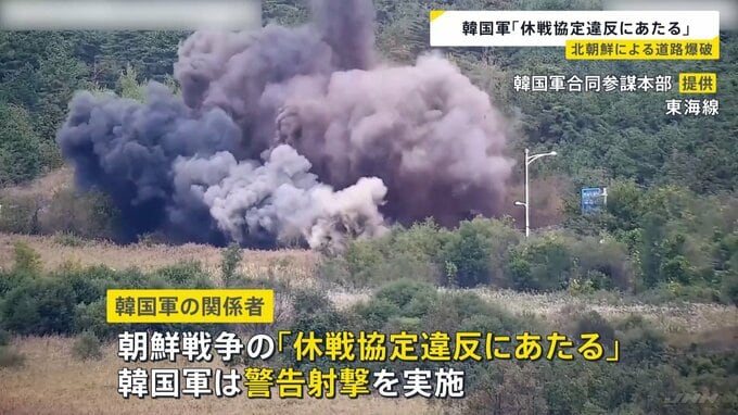 北朝鮮が南北をつなぐ道路を爆破したことについて、韓国軍の関係者は朝鮮戦争の「休戦協定違反にあたる」と批判しました。韓国軍によりますと、北朝鮮はきょう正午ごろ、韓国側とつながる道路のうち北朝鮮側の一部…