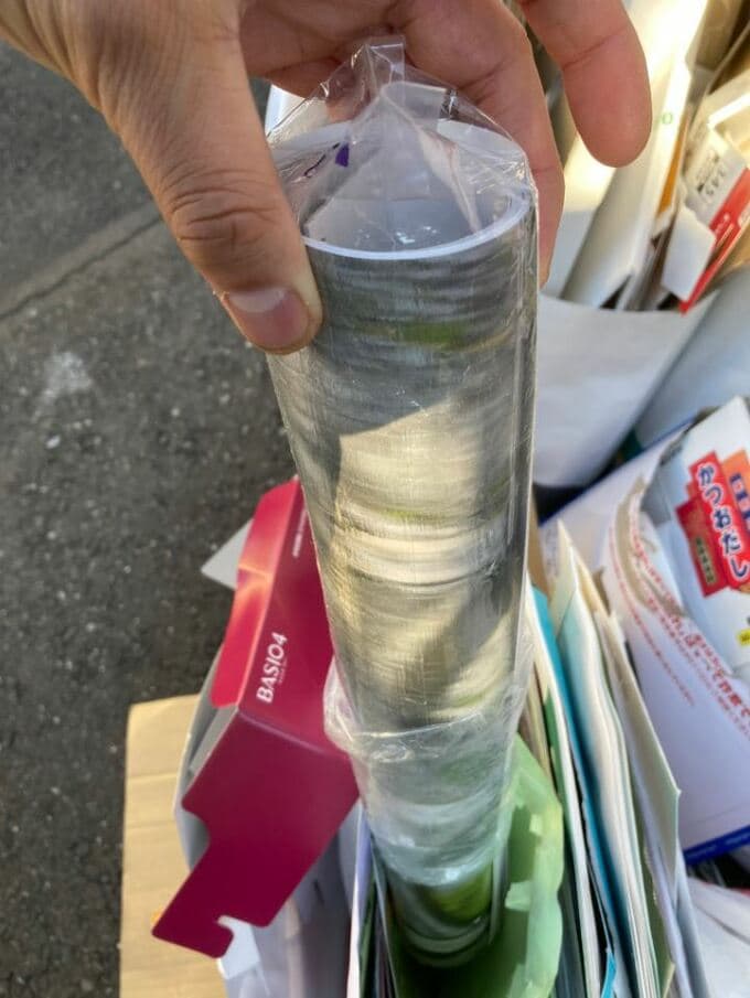 滝沢さんは、回収対象の古紙が詰められた箱に差し込まれた、筒状に丸められたカレンダーの写真を投稿。カレンダーはビニール袋に包まれた格好で差し込まれていました。