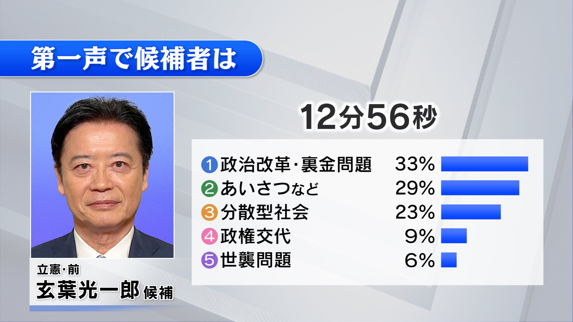 立憲民主党の玄葉さんは、政治改革や裏金問題、そして政権交代について多くの時間を割き、「政治は稼業ではない」と世襲問題についても触れました。