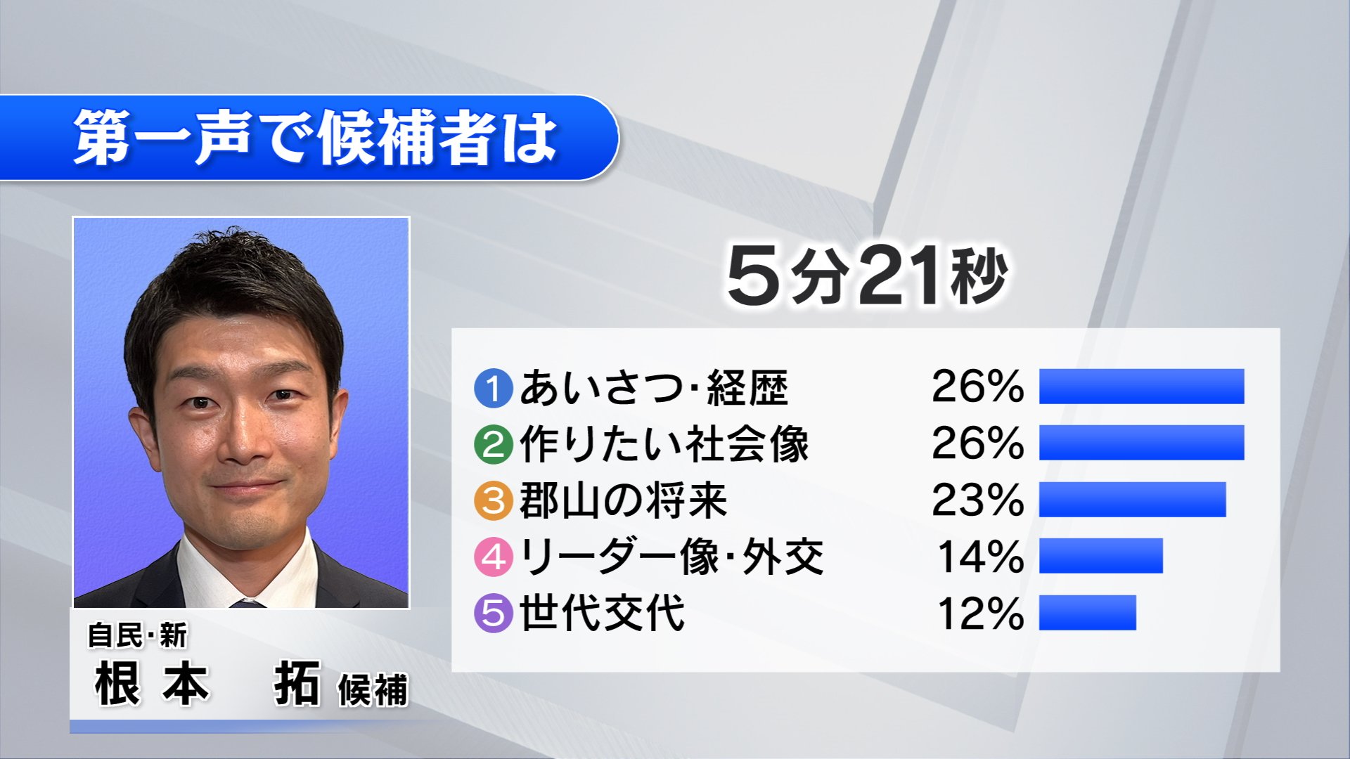 自民党の根本さんは、自身の経歴を紹介しつつ、「世代や性別にとらわれず誰でも輝ける社会」を掲げ、世代交代の必要性を訴えました。