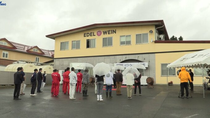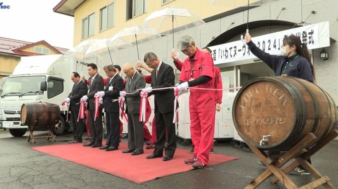 できあがったのはエーデルワインの特別限定品、「いわてヌーヴォー2024」です。16日は関係者が出席して出発式が行われ、小田嶋善明社長が「今年も最高に良い味を追求して素晴らしい新酒ができあがりました」と挨拶し、テープカットをして出荷を祝いました。