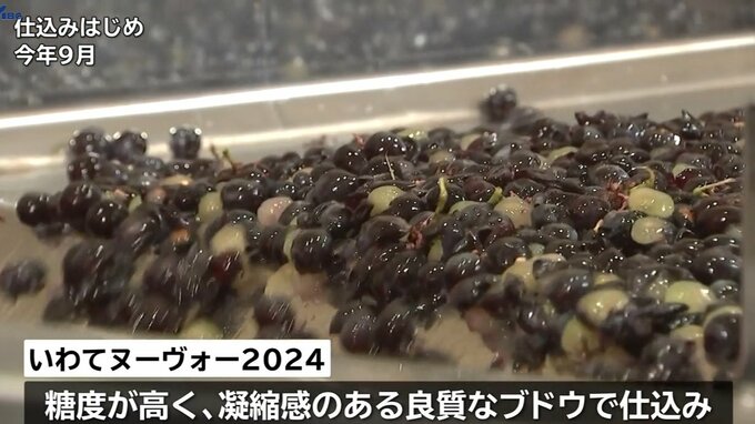9月に仕込みをしたばかりの「いわてヌーヴォー2024」は気温の高い日が続き生育が早めに推移したことで糖度が高く、凝縮感のある良質なブドウで作ることができました。