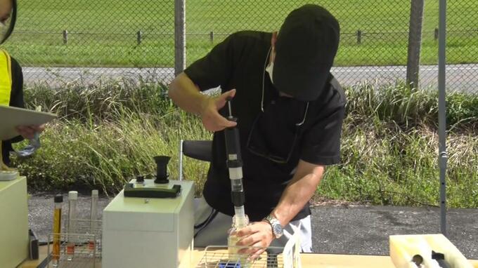 灯油や重油などを混ぜて製造される「不正軽油」の使用や流通を防ごうと、嘉手納町で16日、軽油の抜き取り調査が行われました。