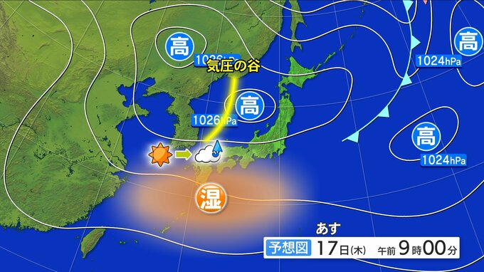 17日(木)晴れ間あるも雲が広がりやすい一日 夜には雨が降る地点も