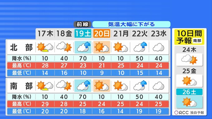 この先金曜日にかけて晴れ間もみられますが、雲が広がりやすくすっきりしない予想です。土曜日は前線の通過のタイミングでまとまった雨になる見込みです。気温は、金曜日にかけて平年よりもかなり高い気温が続きますが、土曜日以降5℃前後下がる予想です。寒暖差で体調を崩さないようご注意ください。