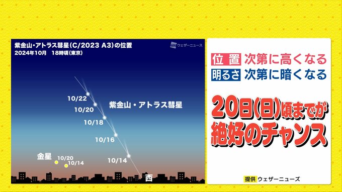 「紫金山アトラス彗星」が日本各地で観測され話題になっていますね。13日(日)に地球に最も接近しましたが、この先20日頃にかけてが綺麗に見られる絶好のチャンスです。この彗星が次回見られるのは8万年後と言われていて、実質見られるのは最初で最後になります。