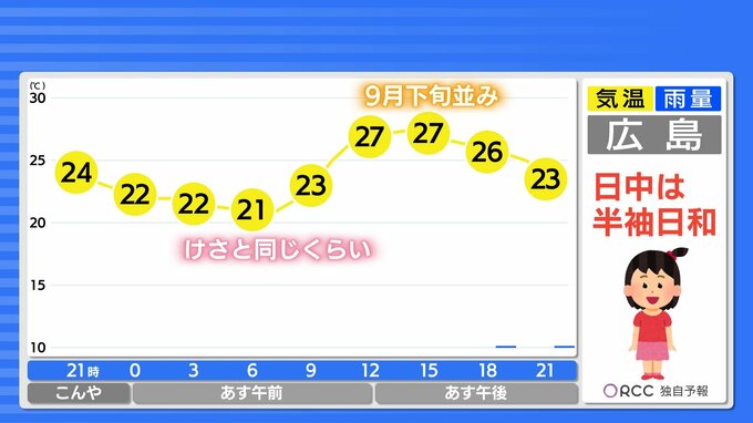 きょう16日(水)の広島県内は、季節外れの暑さになりました。安芸太田町加計では最高気温30.4℃を記録し、県内で最も遅い真夏日を観測しました。広島市中区の最高気温は29.5℃でした。日中は比較的湿度も高く、やや蒸し暑く感じられました。