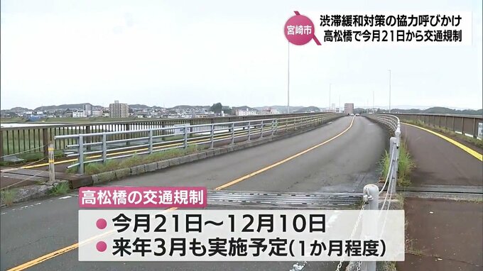 宮崎市の高松橋で、今月21日から交通規制が行われます。これにより、通勤時間帯に近隣の交差点でさらなる渋滞が予想されるとして、宮崎市は市内の企業などに渋滞緩和対策の協力を呼びかけています。宮崎市鶴島と大…