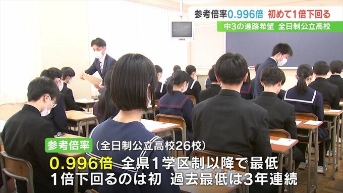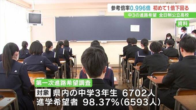 第一次進路希望調査の結果がまとまり全日制公立高校の参考倍率は0.996倍と初めて1倍を下回りました。
