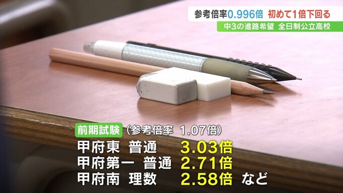 県立と甲府商業高校をあわせた全日制26校の参考倍率は0.996倍で、全県1学区制になってから最も低く初めて1倍を下回りました。