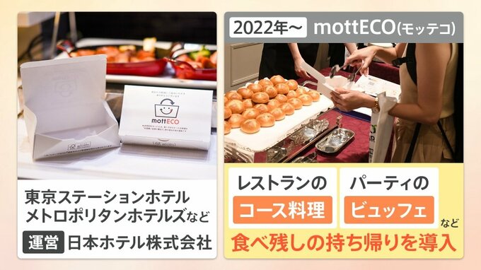 さらにこのサービスはホテル業界にも広がり始めています。日本ホテル株式会社、例えば東京駅の丸の内口にある東京ステーションホテルやメトロポリタンホテルズなどでも、レストランのコース料理やパーティーのビュッフェといった、自分でお値段を払うビュッフェでなければ食べ残しの持ち帰りを導入しています。