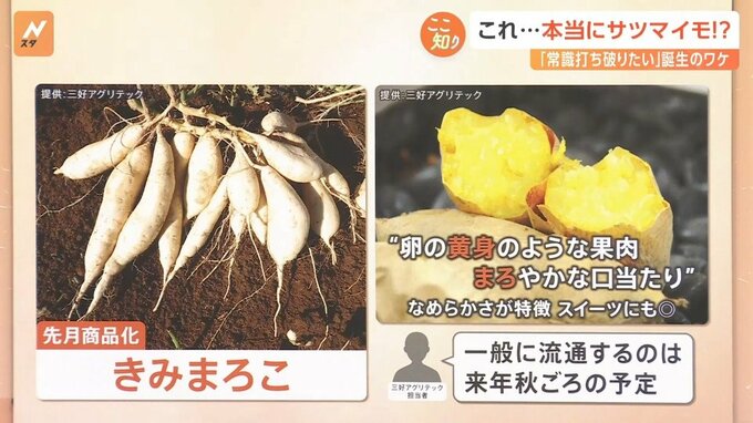 さらに新品種をもう一つ、9月に商品化されたばかりの「きみまろこ」をご紹介します。開発した三好アグリテックの担当者によると、「サツモイモの常識を打ち破りたい!!」という思いで作られたそうです。