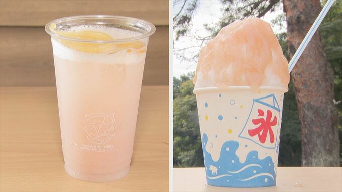 鮮やかな白桃色のソーダに、たっぷりの桃のピューレがかかったかき氷。