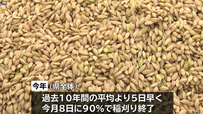 県内は気温の高い状態が続いて、稲の生育が進んだことから、過去10年間の平均と比べて5日早い8日に、県全体の90パーセントで稲刈りが終了したということです。