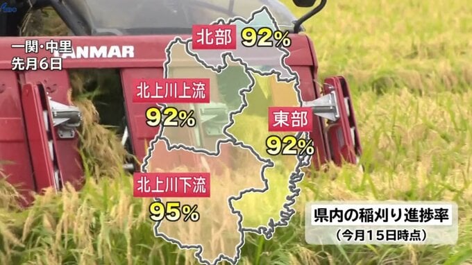 岩手県内の稲刈りの進み具合は15日時点で、県全体で94%となっていて、平年よりも早いペースでほぼ刈り取りが終了しています。