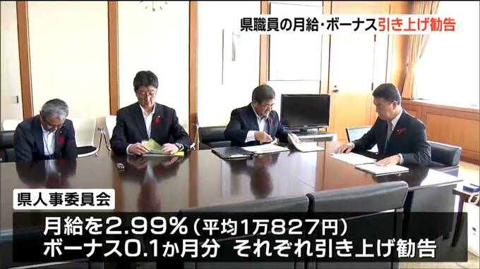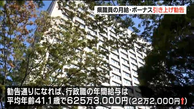 勧告では、月給を2.99%、平均で1万827円、ボーナスも0.1か月分それぞれ引き上げるよう求めています。月給とボーナスの引き上げ勧告は3年連続です。勧告は、民間企業と県職員の給与の格差を解消するために行われるものです。勧告通りになれば、行政職の年間給与は平均年齢41.1歳で22万2000円増えて625万3000円となります。
