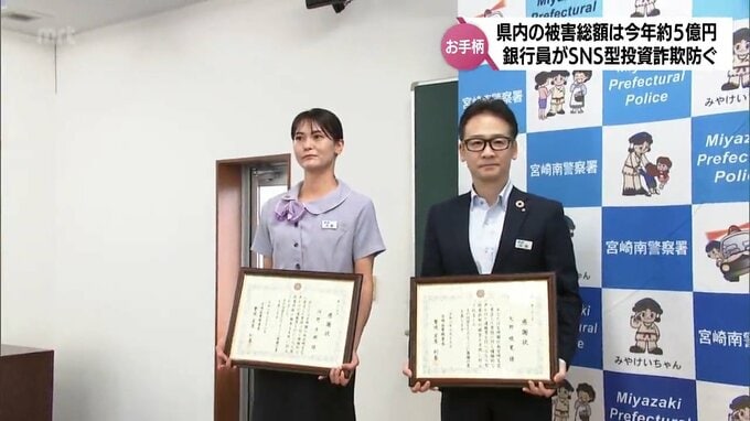 県内でも5億円に近い被害が確認されているSNS型投資詐欺についてです。詐欺の被害を未然に防いだとして、宮崎市の銀行員2人に警察から感謝状が贈られました。感謝状が贈られたのは、宮崎銀行南宮崎支店に勤務する…