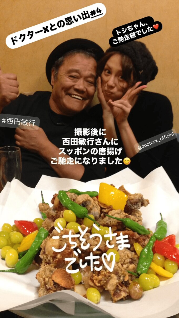 米倉さんは、この投稿の少し前に、西田さんと食事に行った時のインスタグラムのストーリーに写真をアップしており「ドクターXとの思い出#4」「トシちゃん ご馳走様でした♥」「撮影後に 西田敏行さんに スッポンの唐揚げ ご馳走になりました」「ごちそうさま でした♡」と、投稿していました。