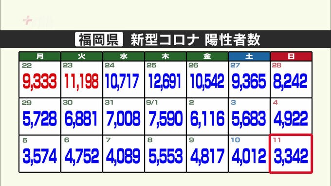 新型コロナウイルスについて福岡県では新たに3342人の陽性が確認されました。亡くなった方はいませんでした。福岡県の11日の新規陽性者数は3342人で、19日連続で前の週の同じ曜日を下回っています…