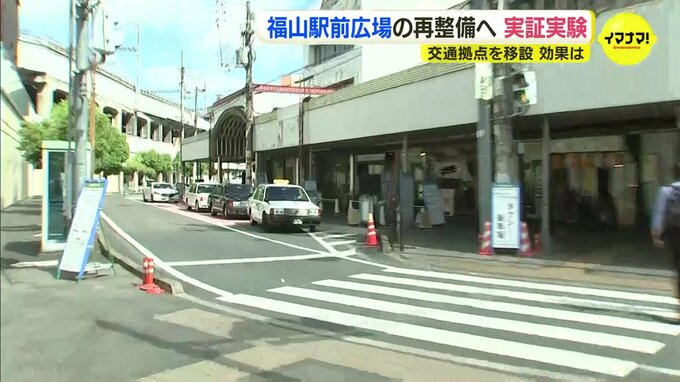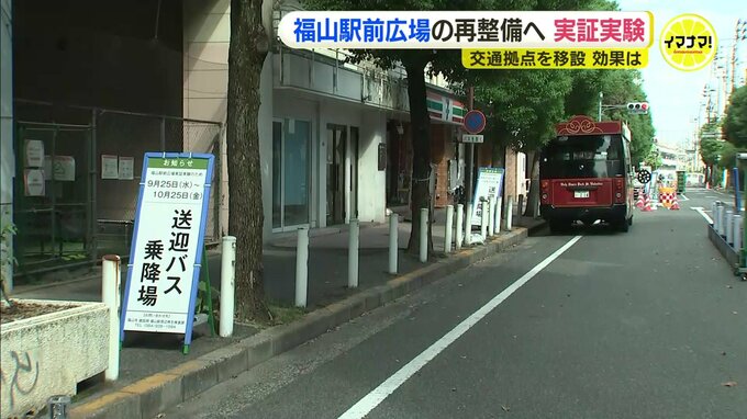 広島県福山市は将来的な福山駅前広場の再整備へ向けて、交通拠点を移設させるなどの影響を探る実証実験に取り組んでいます。