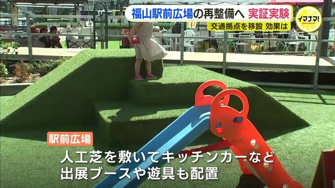 実証実験は9月25日から始まっていて、1か月間行ないます。JR福山駅南口の駅前広場のうち、タクシー乗降場と一部バス乗り場までのおよそ1500平方メートルを広場化しました。