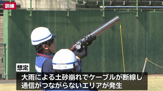訓練は大雨による土砂崩れでケーブルが断線し、電話やインターネットなどの通信がつながらないエリアが発生したという想定で行われました。