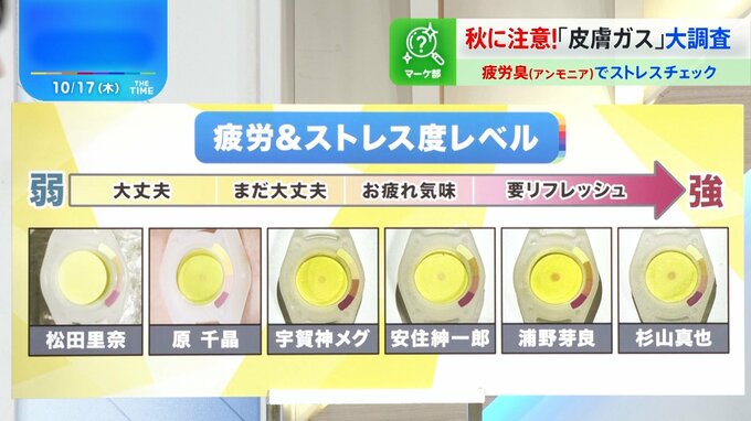 スタジオでは、出演者の「疲労臭」を測定し、疲労&ストレス度をチェックした。放送開始前に検査用のリストバンド「ストレスファインダー」を15分間装着。
