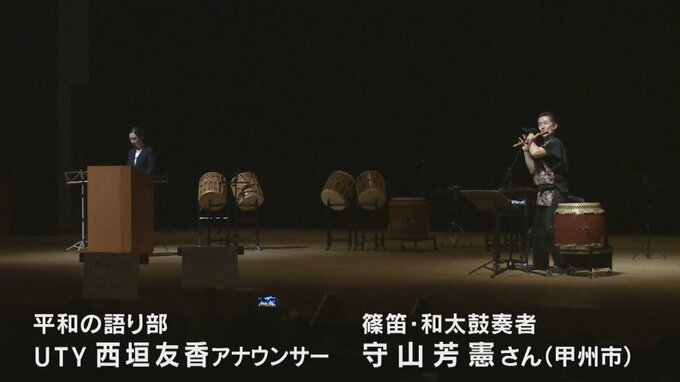 また「平和の語り部」として、西垣友香アナウンサーが甲州市に住む篠笛と和太鼓奏者=守山芳憲さんの演奏とともに、戦地からの手紙や遺族の手記などを朗読しました。