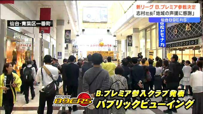 17日午後に行なわれたBリーグの会見に合わせ、仙台市中心部では89ERSによるパブリックビューイングが設けられ、ブースターのほか、買い物客らも足を止め新リーグへの参入決定チームの発表を見守りました。