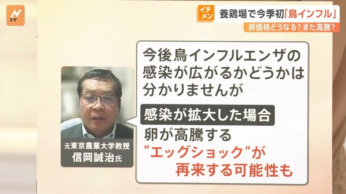 今後の鳥インフルエンザの影響について、元東京農業大学教授の信岡誠治氏は、「今後鳥インフルエンザの感染が広がるかどうかはわかりませんが、感染が拡大した場合、卵が高騰する“エッグショック”が再来する可能性もある」としています。