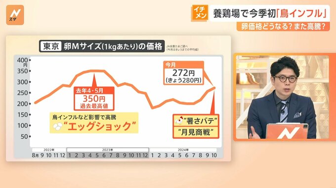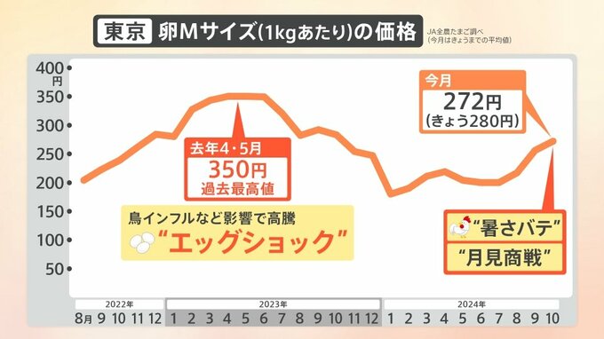 その後、だんだん値段は落ち着いてきましたが、最近はニワトリの“暑さバテ”や“月見商戦”などの影響もあり、10月は平均で1kgあたり272円だということです。(JA全農たまご調べ・10月は17日までの平均値)