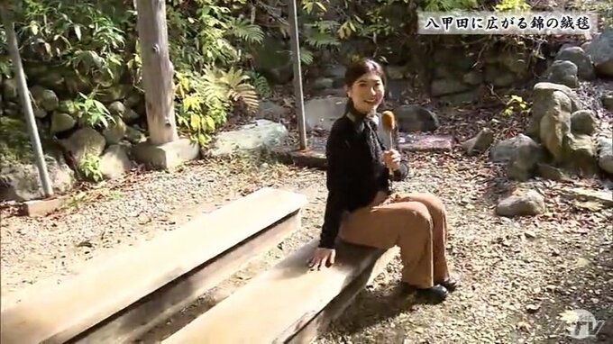 「地獄沼少し下った所にある『まんじゅうふかし』です。こちらではベンチに座って紅葉を見ることができます。実際に座ってみますと、ベンチがじんわり温かいです」