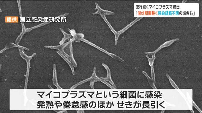 この肺炎はマイコプラズマという細菌に感染して発症するもので、発熱や倦怠感のほか、せきが長引くのが特徴です。子どもを中心に感染が広まりっていて新型コロナほどの感染力はないものの、潜伏期間の長さには注意が必要だといいます。