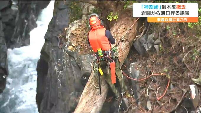 「神割崎」では年に2度岩と岩の間から朝日が上り、幻想的な光景が見られる観光スポットですが9月末、アカマツの木が倒れているのが見つかりました。間もなく岩の間から朝日が昇る時期を迎えることから撤去作業が行われました。