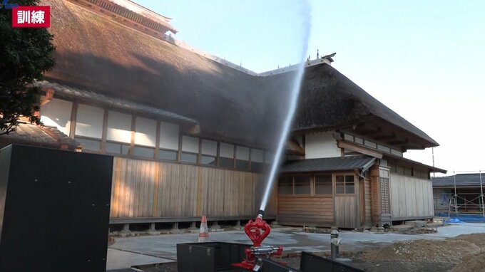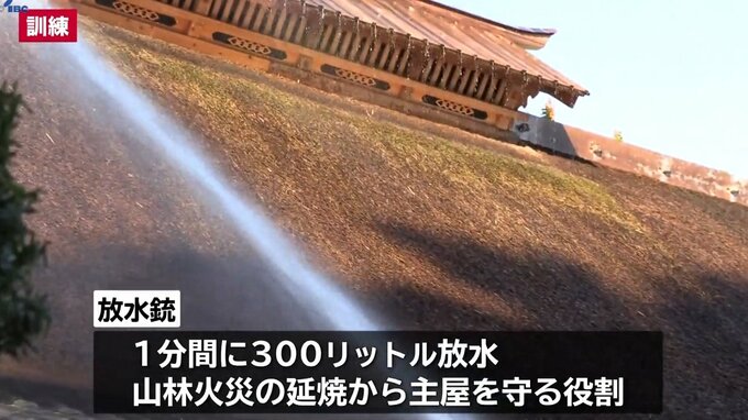 きのうは合図とともに主屋の前後に設置された2基の放水銃から水が屋根を超える高さまで発射され、屋根全体を水しぶきが覆うことを確認しました。