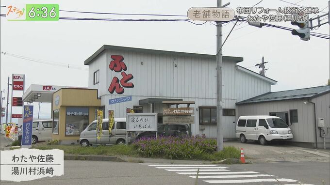 福島県湯川村。美しい田んぼが広がる場所にある、老舗のお店がこちら。「寝るのがいちばん」と思わずうなずいてしまう言葉が書かれた『わたや佐藤』。