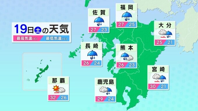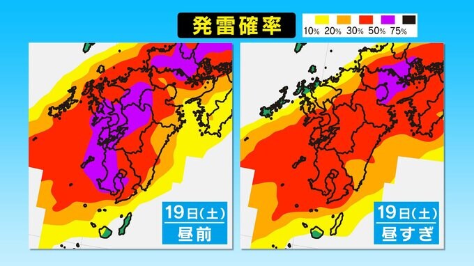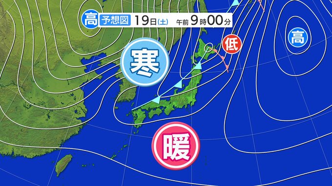 【九州土日の天気】(土)荒れた天気(日)気温下がる 天気も気温も変化が大きい 南日本放送 2024年10月18日(金) 20:00 国内 19日(土)前線南下で雨 前線の北側には「寒気」、南側には「暖気」がある。 北海道付近にある低気圧から延びる寒冷前線に向かって、南から暖かく湿った空気が流れ込んで、大気の状態は非常に不安定となる見込みです。九州地方は、局地的に積乱雲が発達し、激しい雨や落雷、突風のおそれがあります。 19日(土)広い範囲で雨。沖縄は晴れる。 19日(土)発雷確率はかなり高い。 雨と風のシミュレーション19日(土)0時~24時