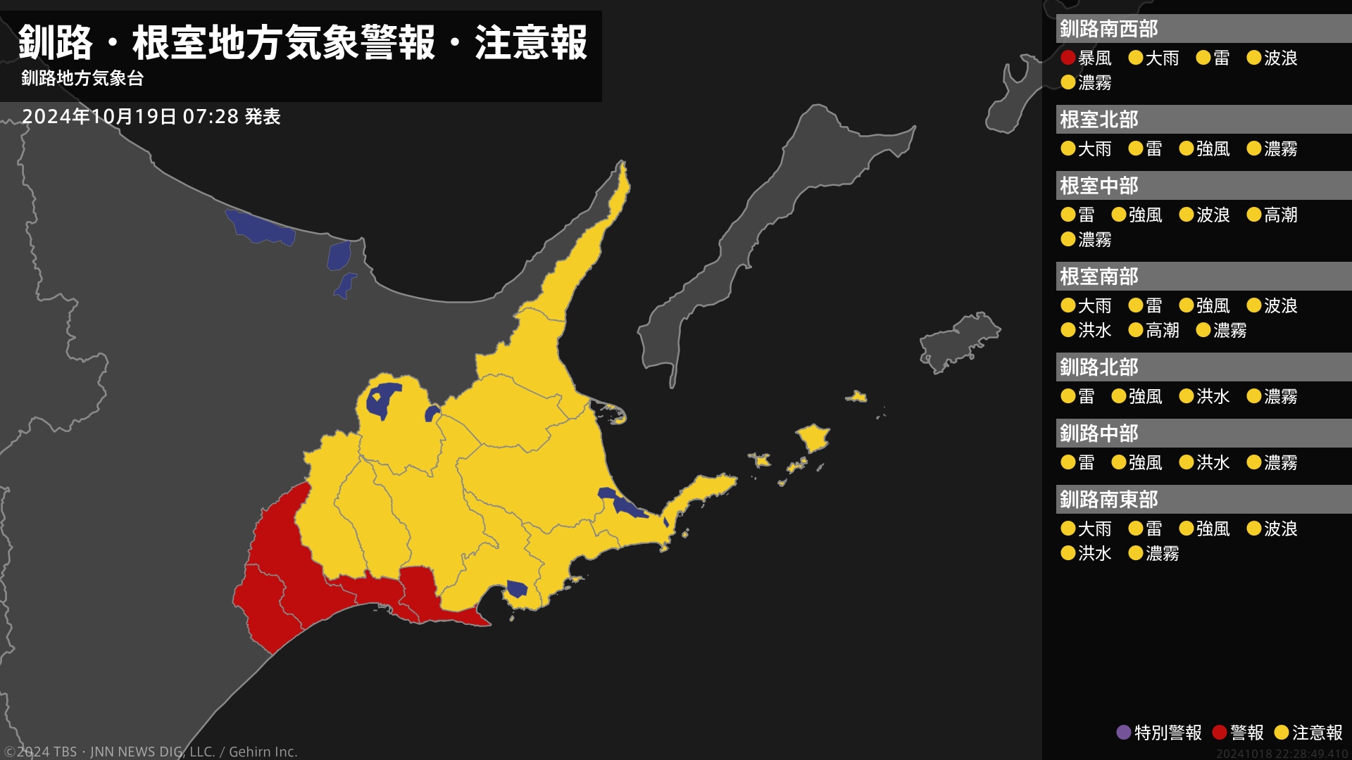 気象台は、午前7時28分に、暴風警報を釧路市釧路、釧路市音別、釧路町、白糠町に発表しました。