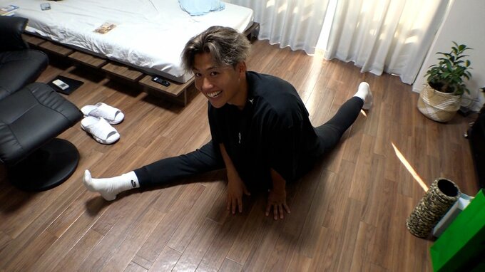 子供の頃から欠かさないというストレッチをして、練習などで疲れた身体をほぐしている。そのおかげもあり身体は前後開脚できるほど柔らかく、怪我が少ない秘訣だと言う。
