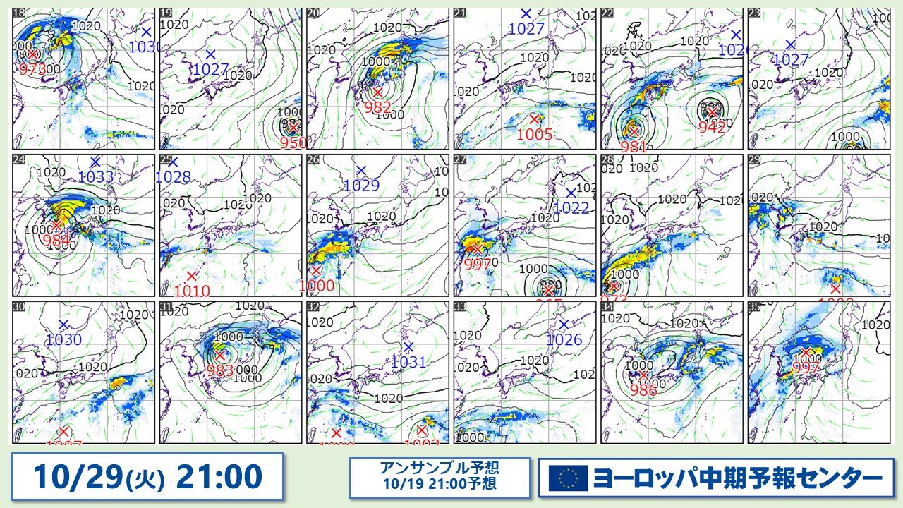 ヨーロッパのアンサンブル予報における10月29日21時の予想図です。アメリカの予報に比べると、台風または熱帯低気圧を北上させるデータが多くなっています。気象庁と比べるとややタイミングは遅いですが本州付近に接近または直撃を予想するデータもあります。