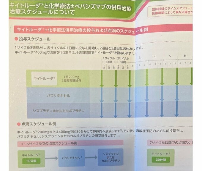そして「スタートは 3週間に一回200mlを 21回点滴投与していました。」「その後 病状が安定していたので『投与期間伸ばすことは可能ですか?』『可能ですよ』という事で 22回目からは 6週間に一回400mlを 点滴投与しています」「そして この治療スケジュールは 治療が始まる前に説明された治療法です」と、治療スケジュールの画像をアップしています。