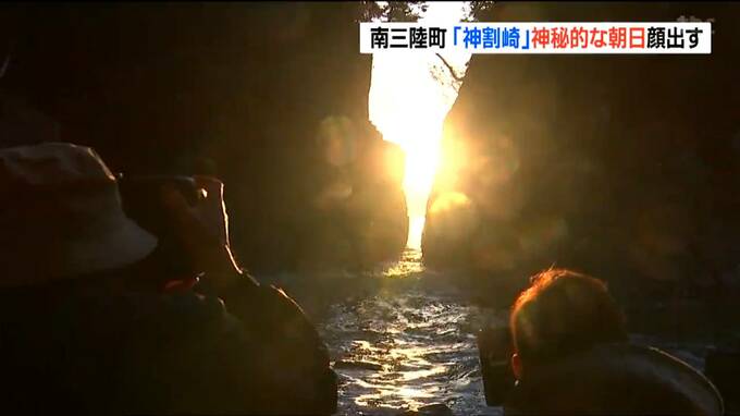 宮城県南三陸町の景勝地「神割崎」では、年に2度の岩の間から上る朝日が見られる時期を迎えました。