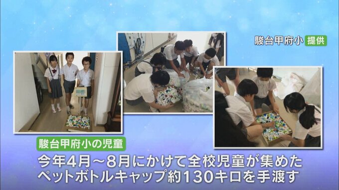 児童らは今年4月から8月にかけて全校児童が集めたペットボトルキャップ約130kgを手渡しました。
