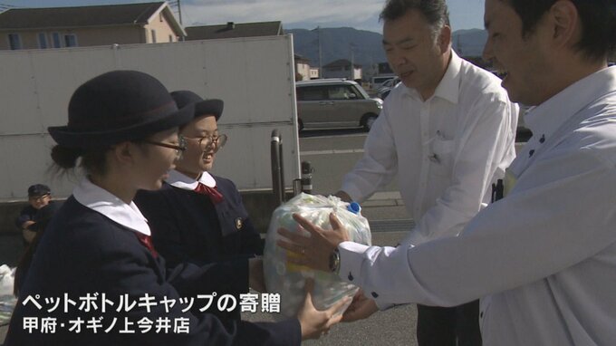 甲府市の小学生が集めたペットボトルキャップがきょう21日スーパーのオギノに寄贈されました。