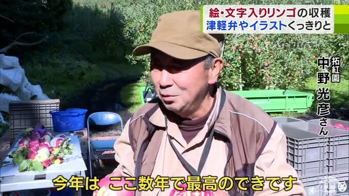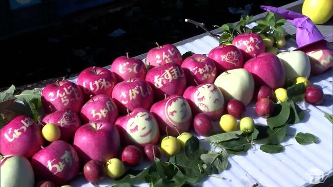青森県鶴田町で、リンゴの着色を利用して実の表面に「文字」や「イラスト」を浮かび上がらせる、絵や文字が入ったリンゴの収穫が行われました。
